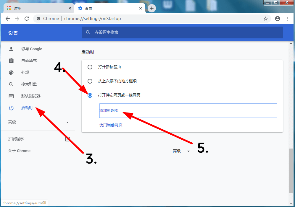 打开Micorsoft Edge浏览器,访问浏览器设置地址: edge://settings/onStartup